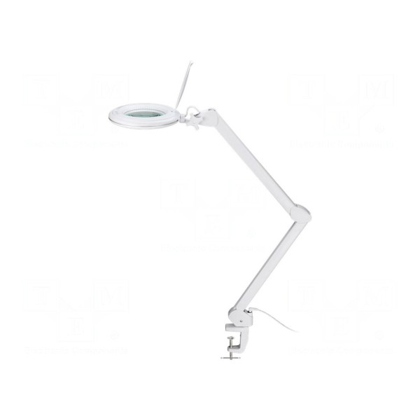 Lupa jest zasilana napięciem 230 V AC przy użyciu standardowej wtyczki typu europejskiego. Produkt wykonany jest w kolorze białym, a jego konstrukcja umożliwia stabilne ustawienie na blacie roboczym.