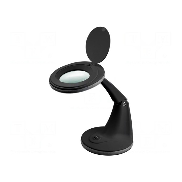 Model ten charakteryzuje się poborem mocy na poziomie 6 W oraz zasilaniem bezpośrednio z sieci 230 V AC za pomocą wtyczki typu europejskiego. Całość konstrukcji utrzymana jest w kolorze czarnym, zapewniając stabilność podczas pracy wymagającej precyzyjnego oświetlenia i powiększenia obserwowanego obszaru.