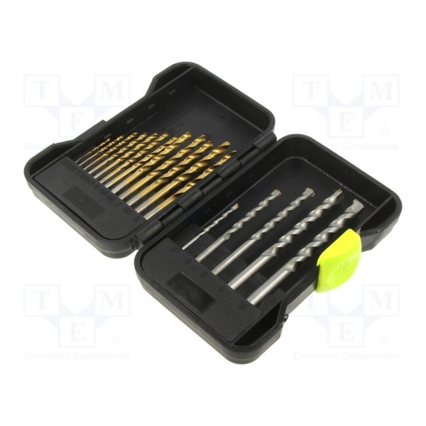 Zestaw zawiera 17 wierteł wykonanych ze stali szybkotnącej HSS, przeznaczonych do obróbki metalu oraz betonu. Narzędzia zostały pokryte azotkiem tytanu, co wpływa na ich parametry eksploatacyjne. Wiertła posiadają konstrukcję samocentrującą, która ułatwia rozpoczęcie wiercenia w obrabianym materiale.
