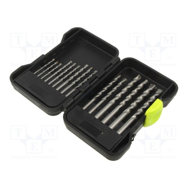 Zestaw zawiera 15 wierteł o średnicach 3mm, 4mm, 5mm, 6mm, 8mm oraz 10mm, przeznaczonych do pracy z betonem oraz kamieniem. Wiertła posiadają uchwyt cylindryczny, co umożliwia ich mocowanie w standardowych uchwytach narzędziowych.