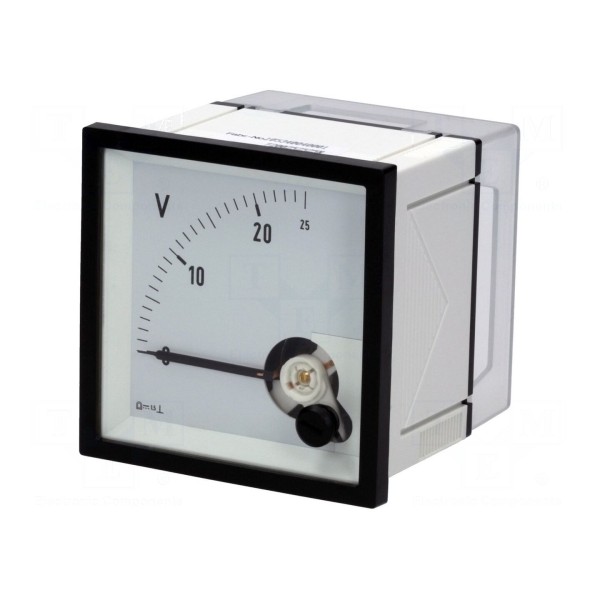 Woltomierz analogowy przeznaczony do montażu panelowego umożliwia precyzyjny pomiar napięcia stałego w zakresie od 0 do 25V. Urządzenie charakteryzuje się klasą dokładności 1,5, co zapewnia rzetelność wskazań w standardowych zastosowaniach przemysłowych. Przyrząd został zaprojektowany do pracy w pozycji pionowej.