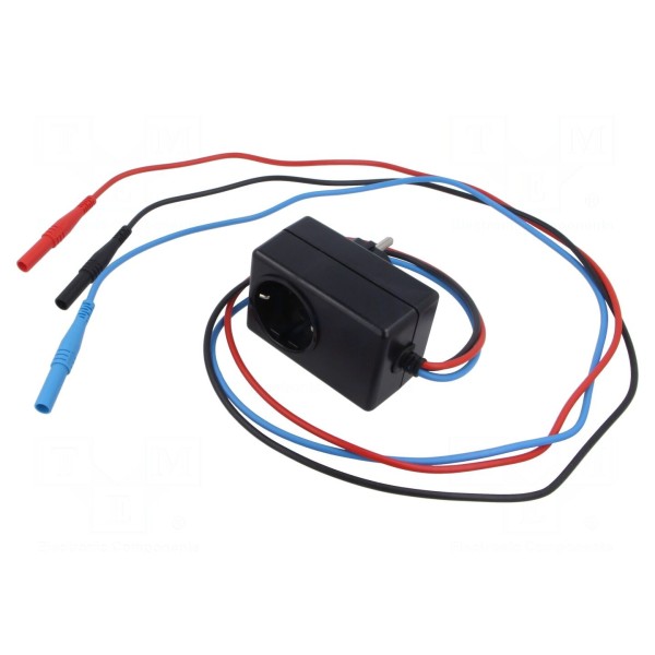 Adapter jest przeznaczony do połączeń w systemach pomiarowych, umożliwiając przejście między standardowym gniazdem typu SCHUKO a złączami bananowymi 4mm. Konstrukcja urządzenia obejmuje trzy wtyki bananowe 4mm, gniazdo SCHUKO oraz wtyk SCHUKO.