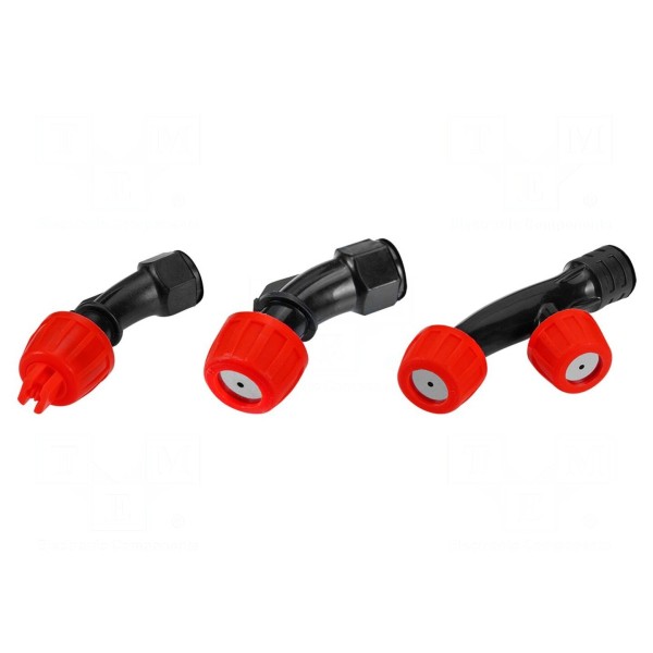 Akcesorium w formie zestawu trzech dysz przeznaczonych do akumulatorowego opryskiwacza ogrodowego GRAPHITE 58GE106 o ciśnieniu pracy do 3 bar.