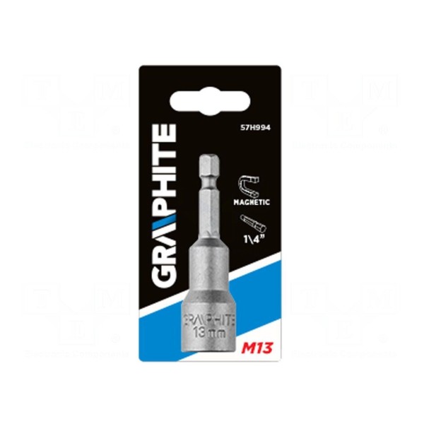 Końcówka wkrętakowa GRAPHITE wyposażona w nasadkę sześciokątną o rozmiarze 13 mm przeznaczona jest do współpracy z uchwytami o standardzie 1/4". Narzędzie zostało wykonane w wersji magnetycznej, co ułatwia utrzymanie elementu złącznego wewnątrz nasadki podczas pracy.