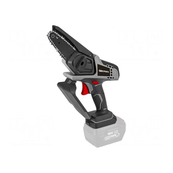 Piła łańcuchowa typu mini oferuje prędkość obrotową wynoszącą 5400obr./min oraz długość cięcia 80mm. Urządzenie jest zasilane napięciem 18V DC z zewnętrznego akumulatora Li-Ion.
