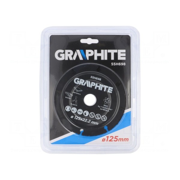 Piła tarczowa GRAPHITE o średnicy 125 mm została zaprojektowana do pracy z elektronarzędziami. Tarcza charakteryzuje się grubością wynoszącą 1,2 mm oraz posiada gniazdo uchwytu o rozmiarze 22,2 mm.