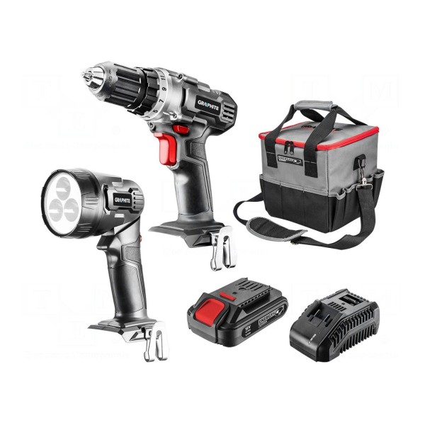 W zestawie: ładowarka, latarka, torba przenośna, wiertarko-wkrętarka.