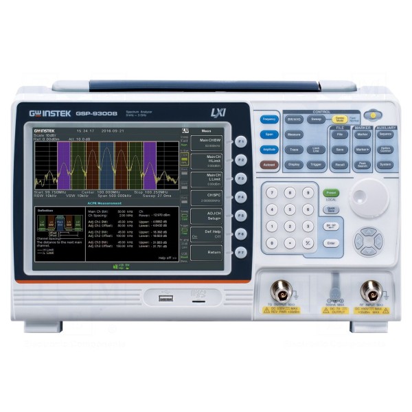 Analizator widma GW INSTEK GSP-9300B to urządzenie przeznaczone do pracy w zakresie częstotliwości od 9kHz do 3GHz przy impedancji wejściowej 50Ω. Przyrząd oferuje rozdzielczość 1Hz oraz poziom odniesienia amplitudy w zakresie od 0dBm do 50dBm. Wyposażono go w szereg funkcji wspierających analizę sygnałów, takich jak demodulator, wykrywanie pola elektrycznego (funkcja EF), testowanie typu Pass/Fail oraz opcję podziału ekranu.