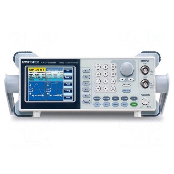 Generator laboratoryjny GW INSTEK AFG-2225 to dwukanałowe urządzenie obsługujące przebiegi typu sinus, prostokątny, ramp oraz szum. Maksymalna częstotliwość pracy wynosi 25MHz, przy czym zakres pracy dla przebiegów sinusoidalnych i prostokątnych osiąga 25MHz, a dla przebiegów typu ramp 1MHz. Urządzenie oferuje rozdzielczość pionową 10bit oraz próbkowanie na poziomie 120Msps, co pozwala na generowanie 66 wbudowanych przebiegów oraz wsparcie dla przebiegów arbitralnych z długością rekordu pamięci 2kpts na kanał.