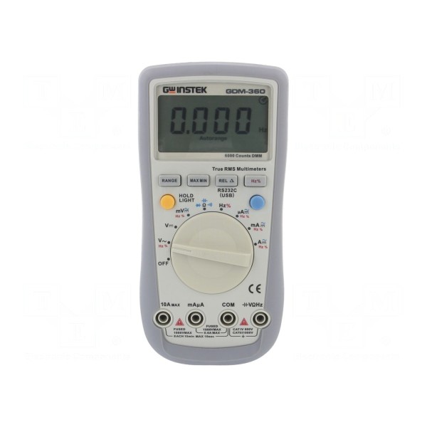 Multimetr cyfrowy GDM-360 to urządzenie przeznaczone do pomiaru napięcia AC/DC, prądu AC/DC, rezystancji, pojemności, częstotliwości oraz współczynnika wypełnienia. Przyrząd obsługuje funkcję pomiaru rzeczywistej wartości skutecznej True RMS oraz posiada wbudowany test ciągłości obwodu z sygnałem akustycznym i test diod. Pomiar napięcia DC odbywa się z dokładnością ±(0,5% + 1 digit), natomiast pomiar rezystancji z dokładnością ±(0,1%+2 digit). Urządzenie oferuje zakresy napięcia DC do 600V oraz napięcia AC do 750V.