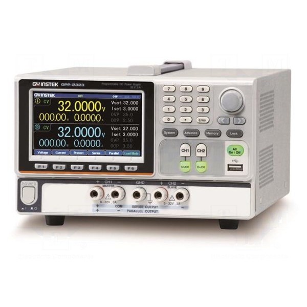 GW INSTEK GPP-2323 to programowalny zasilacz laboratoryjny o konstrukcji liniowej, wyposażony w dwa niezależne kanały wyjściowe. Każdy z kanałów umożliwia regulację napięcia w zakresie od 0 do 32V DC oraz natężenia prądu w zakresie od 0 do 3A. Urządzenie pozwala na pracę w trybie stabilizacji prądowej lub napięciowej, a także na łączenie kanałów w układach szeregowych, równoległych lub niezależnych.