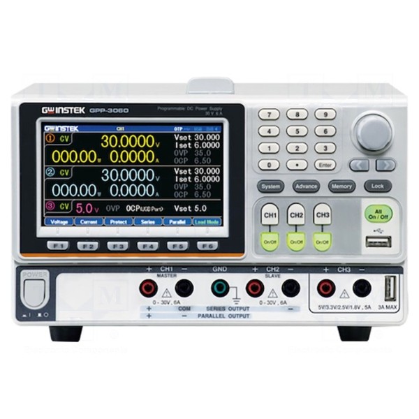 GW INSTEK GPP-3060 to programowalny zasilacz laboratoryjny wyposażony w trzy kanały wyjściowe. Pierwsze dwa kanały oferują napięcie wyjściowe w zakresie 0–30V DC oraz prąd do 6A, natomiast trzeci kanał pozwala na wybór stałych napięć 1,8V, 2,5V, 3,3V lub 5V przy maksymalnym prądzie 5A. Urządzenie charakteryzuje się tętnieniami i szumami napięcia na poziomie ≤1mVrms oraz wysoką stabilnością pracy. Łączna moc wyjściowa zasilacza wynosi 385W.