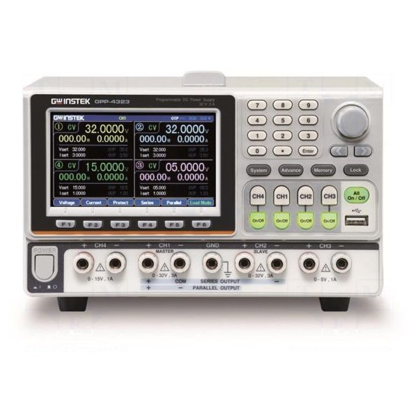 GW INSTEK GPP-4323 to programowalny zasilacz laboratoryjny o konstrukcji liniowej, wyposażony w cztery niezależne kanały wyjściowe. Urządzenie oferuje dwa regulowane kanały o parametrach 0...32V DC / 0...3A, trzeci kanał 0...5V DC / 0...1A oraz czwarty kanał 0...15V DC / 0...1A. Konstrukcja pozwala na pracę sekcji w trybach stabilizacji prądowej lub napięciowej, a także na łączenie ich w konfiguracje szeregowe, równoległe lub niezależne.