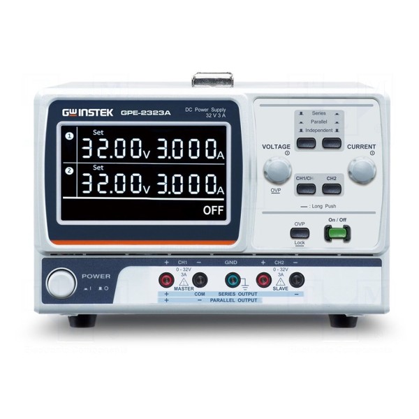 GW INSTEK GPE-2323A to liniowy, wielokanałowy zasilacz laboratoryjny wyposażony w dwa niezależne kanały wyjściowe. Każdy z kanałów umożliwia regulację napięcia w zakresie 0–32V DC oraz prądu w zakresie 0–3A, co pozwala na elastyczne dopasowanie parametrów pracy do wymagań zasilanego układu. Rozdzielczość nastaw napięcia wynosi 10mV, natomiast prądu 1mA, co zapewnia precyzyjną kontrolę nad dostarczaną energią.