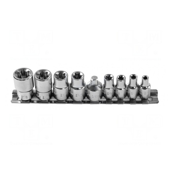 Komplet składa się z 9 elementów o konstrukcji nasadowej. Całość stanowi zestaw dedykowany do obsługi śrub z gniazdem Torx.