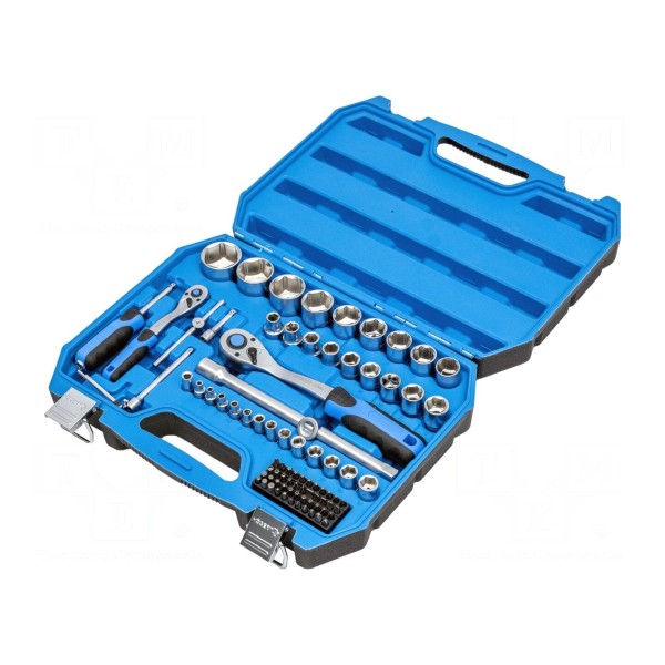 W zestawie: grzechotka 1/2", grzechotka 1/4", końcówki wkrętakowe, nasadki 6-kątne 1/2", nasadki 6-kątne 1/4", pokrętło wkrętakowe 1/4", przedłużacz 1/2" o długości 50mm, przedłużacz 1/2" o długości 100mm.