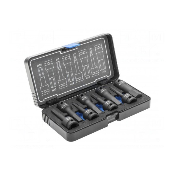 Zestaw zawiera 8 kluczy udarowych typu imbusowego o rozmiarze gniazda uchwytu 1/2". Komplet narzędzi został zaprojektowany do współpracy z urządzeniami udarowymi.