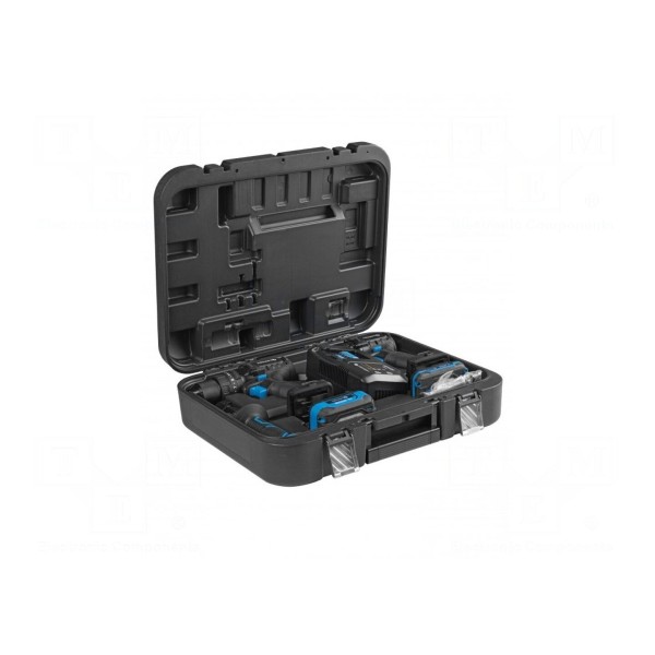 W zestawie: ładowarka, walizka, wiertarko-wkrętarka, zakrętarka udarowa. Zasilanie realizowane jest przy pomocy akumulatorów Li-Ion 18V o pojemności 2000mAh oraz 4000mAh.