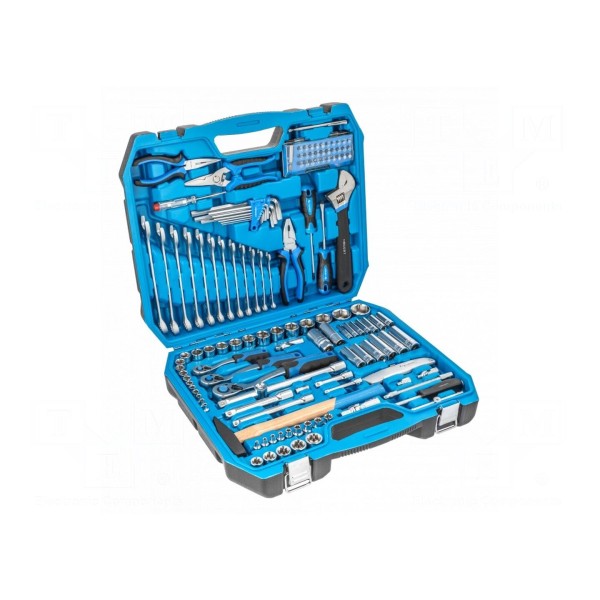 Zestaw narzędzi ogólnego stosowania zawiera 131 elementów. Komplet został zaprojektowany do szerokiego zakresu prac montażowych oraz serwisowych.