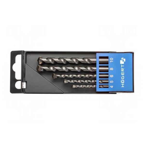 W skład kompletu wchodzą wiertła o średnicach 4 mm, 5 mm, 6 mm, 8 mm oraz 10 mm. Produkt jest przeznaczony do prac wymagających wiercenia w twardych materiałach budowlanych.