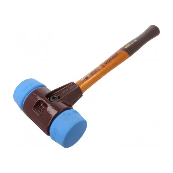 Młotek serii SIMPLEX wyposażony jest w okrągłą końcówkę wykonaną z niebieskiego elastomeru, która charakteryzuje się miękkością. Głowica narzędzia ma średnicę 60mm, a masa samego obucha wynosi 1,46kg.