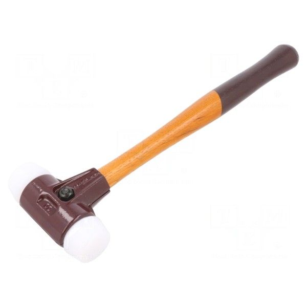 Młotek blacharski wyposażony w okrągłą końcówkę wykonaną z plastiku. Narzędzie posiada trzonek z drewna, co zapewnia pewny chwyt podczas pracy.