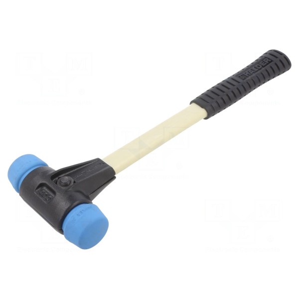 Końcówka narzędzia wykonana została z elastomeru w kolorze niebieskim, co zapewnia miękką powierzchnię uderzeniową. Trzonek młotka wyprodukowano z włókna szklanego, co wpływa na jego sztywność podczas eksploatacji.