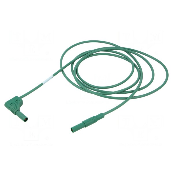 Przewód pomiarowy o długości 2 m charakteryzuje się prądem znamionowym 16 A oraz napięciem znamionowym 1 kV. Został wyposażony w izolowane wtyki bananowe 4 mm, w tym jeden wtyk kątowy, co ułatwia prowadzenie połączeń w miejscach o ograniczonej przestrzeni. Przekrój przewodu wynosi 1 mm².