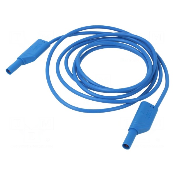 Złącza po obu stronach przewodu stanowią wtyki bananowe z gniazdem osiowym 4 mm, które są w pełni izolowane. Elementy stykowe wykonano z niklowanego mosiądzu, co zapewnia trwałe połączenie elektryczne. Przewód dostępny jest w kolorze niebieskim, a jego budowa umożliwia wykonywanie połączeń szeregowych dzięki zastosowaniu gniazd osiowych.