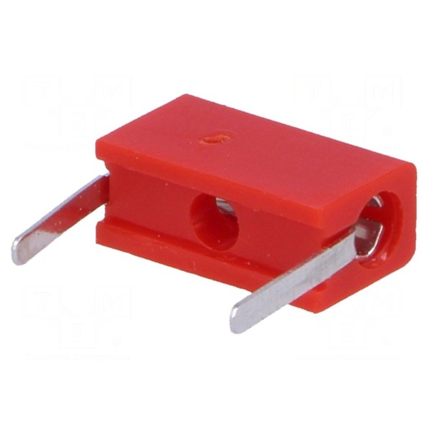 Styk wykonany jest z mosiądzu i posiada cynowane pokrycie. Gniazdo o długości całkowitej 10,25mm wyposażone jest w wyprowadzenia przeznaczone do lutowania. Komponent utrzymany jest w kolorze czerwonym.