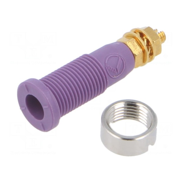 Gniazdo wykonane zostało z mosiądzu, a jego styki poddano procesowi złocenia. Całkowita długość złącza wynosi 31mm, a jego kolor to fioletowy. Produkt jest przystosowany do montażu lutowanego oraz przykręcanego za pomocą gwintu M3. Urządzenie może pracować w temperaturze otoczenia mieszczącej się w zakresie od -25°C do 70°C.
