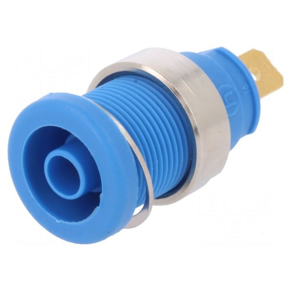 Złącze posiada izolację wykonaną z poliamidu, a jego montaż odbywa się za pomocą połączenia przykręcanego. Całkowita długość elementu wynosi 32 mm, a obudowa utrzymana jest w kolorze niebieskim. Produkt spełnia wymagania norm bezpieczeństwa CAT III 1000 V oraz EN 61010, co pozwala na zastosowanie go w wymagających środowiskach pomiarowych.