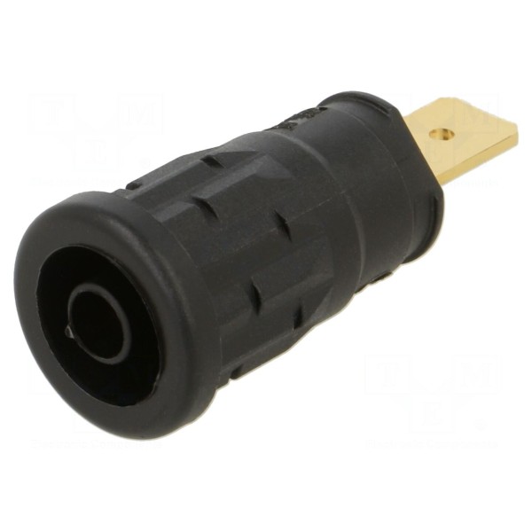 Złącze laboratoryjne w formie gniazda bananowego 4mm zaprojektowane do pracy przy napięciu znamionowym 1kV oraz prądzie znamionowym 32A. Element wykonano z mosiądzu, a jego styki zostały poddane procesowi złocenia, co zapewnia parametry połączenia elektrycznego w szerokim zakresie temperatur roboczych od -40°C do 80°C.