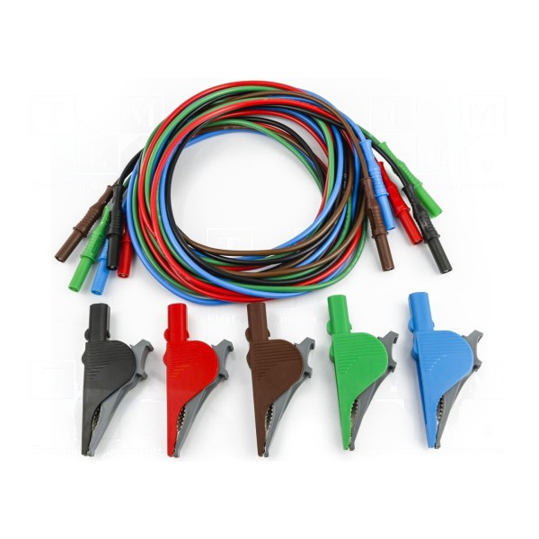 Zestaw przewodów pomiarowych składa się z pięciu przewodów o długości 2m każdy, zakończonych obustronnie wtykiem bananowym 4mm. Zapewniają one prąd znamionowy na poziomie 36A przy napięciu znamionowym 1kV. Zestaw dostępny jest w kolorach brązowym, czarnym, czerwonym, niebieskim oraz zielonym.