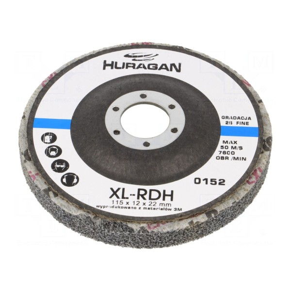 Tarcza szlifierska wykonana z włókniny przeznaczona jest do prac wykończeniowych oraz obróbki powierzchniowej. Element charakteryzuje się wymiarami 115x12 mm oraz średnicą otworu mocującego wynoszącą 22 mm.