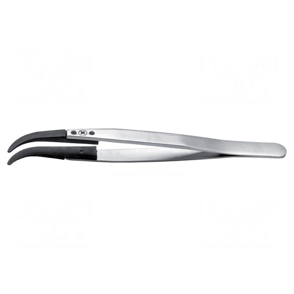 Narzędzie typu pęseta zagięta o długości całkowitej 130 mm wyposażone w wymienne końcówki o płaskim kształcie. Konstrukcja elementu roboczego wykonana jest z materiału PEEK, co zapewnia specyficzne właściwości fizykochemiczne podczas pracy z delikatnymi komponentami.