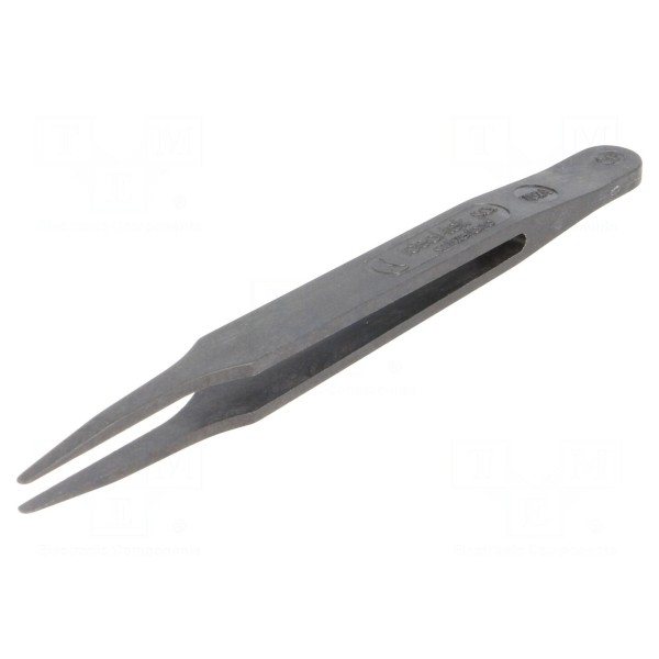 Pęseta prosta o długości 115 mm została wykonana z poliamidu wzmocnionego włóknem przewodzącym, co zapewnia właściwości antystatyczne (ESD). Narzędzie wyposażone jest w płaską końcówkę o szerokości 2 mm, co umożliwia precyzyjną manipulację elementami. Konstrukcja charakteryzuje się wysoką sprężystością oraz całkowitą niemagnetycznością.