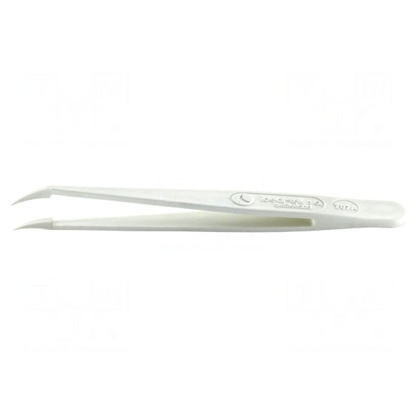 Pęseta IDEAL-TEK 707A.DG to narzędzie wykonane z tworzywa Delrin, przeznaczone do pracy w środowisku wymagającym ochrony przed wyładowaniami elektrostatycznymi. Model w wersji ESD charakteryzuje się zagiętym kształtem oraz ostrym zakończeniem końcówki.