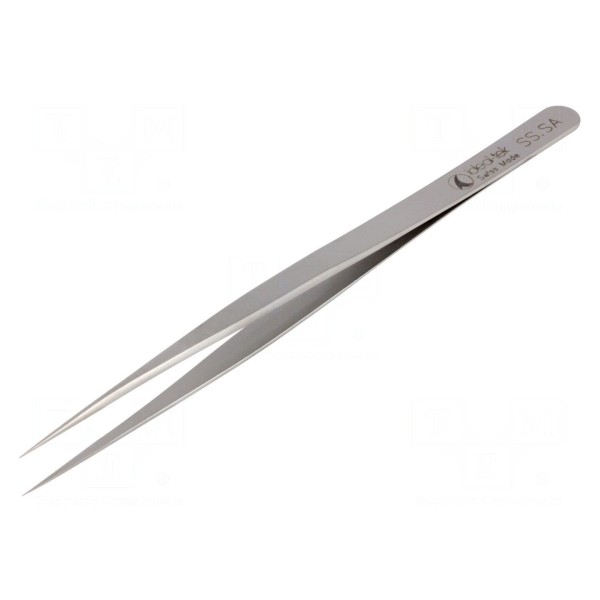 Pęseta prosta o długości 140 mm została wykonana ze stali nierdzewnej. Narzędzie posiada ostry kształt końcówki, co umożliwia realizację czynności wymagających dużej precyzji.
