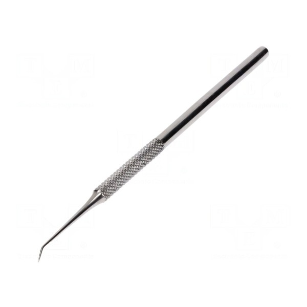 Skrobak o długości 150 mm wykonany ze stali nierdzewnej przeznaczony jest do prac serwisowych przy układach elektronicznych. Narzędzie wyposażone jest w ostrą końcówkę o zagiętym profilu, co ułatwia dostęp do trudno dostępnych miejsc na płytkach drukowanych.