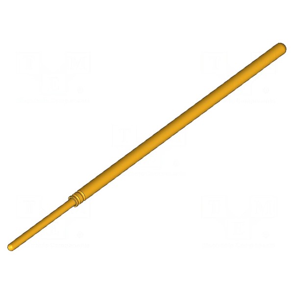 Igła testowa charakteryzuje się prądem znamionowym 4A oraz maksymalną rezystancją styku wynoszącą 20mΩ. Komponent został wykonany z miedzi berylowej (CuBe) z pozłacaną powierzchnią styku, co zapewnia parametry przewodnictwa w zakresie temperatur od -40°C do 80°C. Końcówka o kształcie okrągłym posiada średnicę 0,64mm.