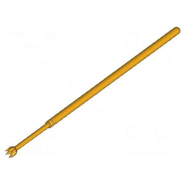 Igła testowa przeznaczona jest do systemów pomiarowych, charakteryzując się prądem znamionowym 3A oraz maksymalną rezystancją styku na poziomie 20mΩ. Element wykonany jest ze stali ze złoconą powłoką, co zapewnia parametry przewodzenia. Końcówka o średnicy 1,3mm posiada 6-punktowy kształt korony ze środkowym punktem.