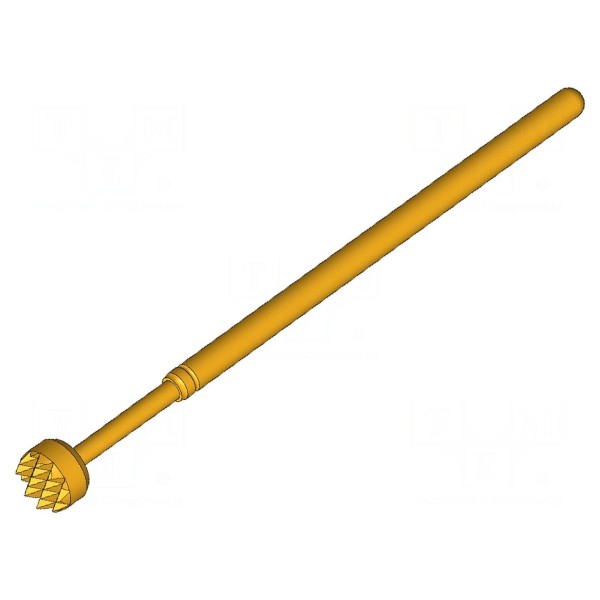 Igła testowa o długości 33,4 mm przeznaczona jest do montażu wciskanego. Element wyposażono w ząbkowaną końcówkę o średnicy 3 mm, co umożliwia stabilny kontakt podczas procesu pomiarowego. Komponent wykonany jest z miedzi berylowej (CuBe) z pozłacaną powierzchnią styku, co zapewnia rezystancję styku na poziomie maksymalnie 20 mΩ.