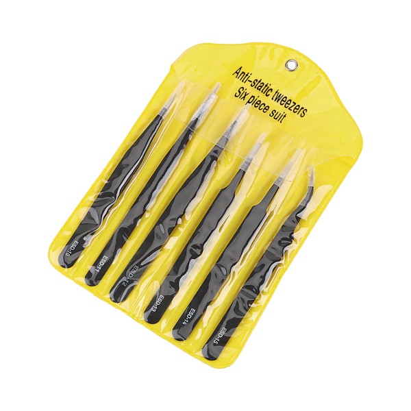 Zestaw zawiera sześć pęset o właściwościach antystatycznych przeznaczonych do prac wymagających ochrony przed wyładowaniami elektrostatycznymi.