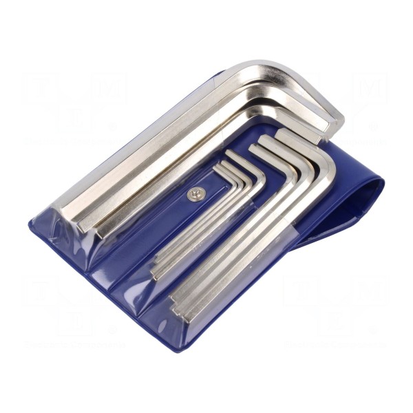 Zestaw zawiera 10 sztuk kluczy imbusowych typu L wykonanych ze stali. Powierzchnia narzędzi została poddana procesowi niklowania, co wpływa na ich odporność na korozję.