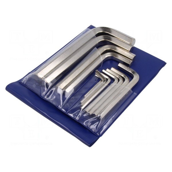 Zestaw kluczy imbusowych składa się z 13 elementów wykonanych ze stali. Powierzchnia narzędzi została poddana procesowi niklowania, co wpływa na wykończenie elementu.