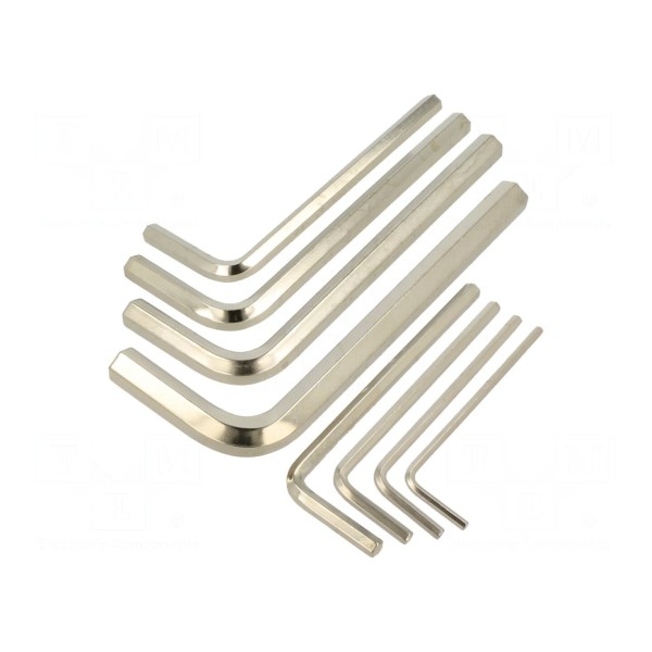 Zestaw zawiera osiem kluczy imbusowych wykonanych ze stali. Powierzchnia narzędzi została poddana procesowi niklowania, co wpływa na ich wykończenie.