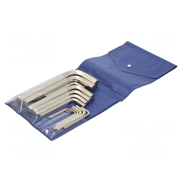 Zestaw zawiera 15 kluczy imbusowych typu HEX, wykonanych ze stali. Każdy element został poddany procesowi niklowania, co wpływa na wykończenie powierzchni narzędzi.