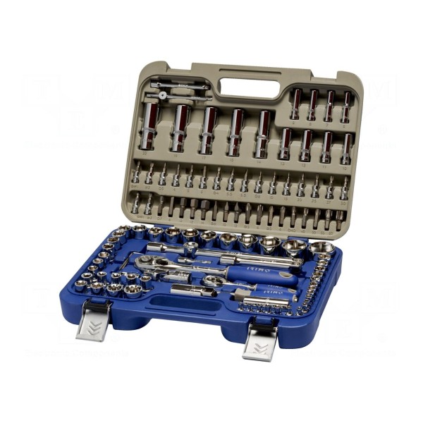 Zestaw narzędzi zawiera 108 elementów, w tym klucze nasadowe o różnych profilach. W komplecie znajdują się narzędzia z gniazdami uchwytu w rozmiarach 1/2" oraz 1/4", co pozwala na obsługę połączeń śrubowych o zróżnicowanej wielkości.
