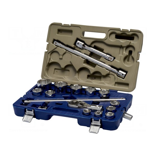 Konstrukcja narzędzi przystosowana jest do obsługi gniazd o wymiarze 3/4 cala. W zestawie znajduje się 17 sztuk akcesoriów wchodzących w skład kompletu.